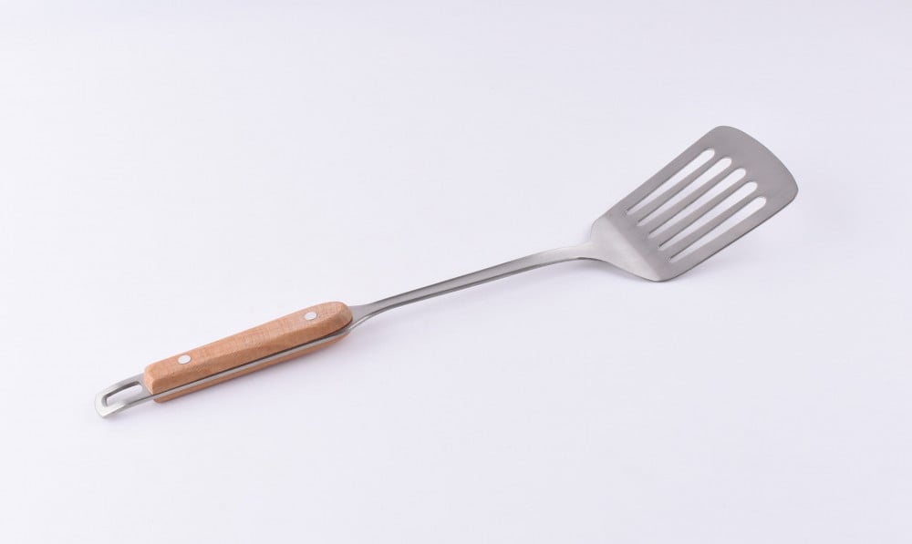 معلقة طبخ استانلس ستيل بمقبض خشبي مميزة لاستخداماتك المتعددة، معلقة مشقوقة للغرف تسهل عليك الكثير من الأمور لمطبخ أكثر أناقة وبجودة عالية.