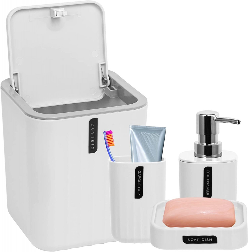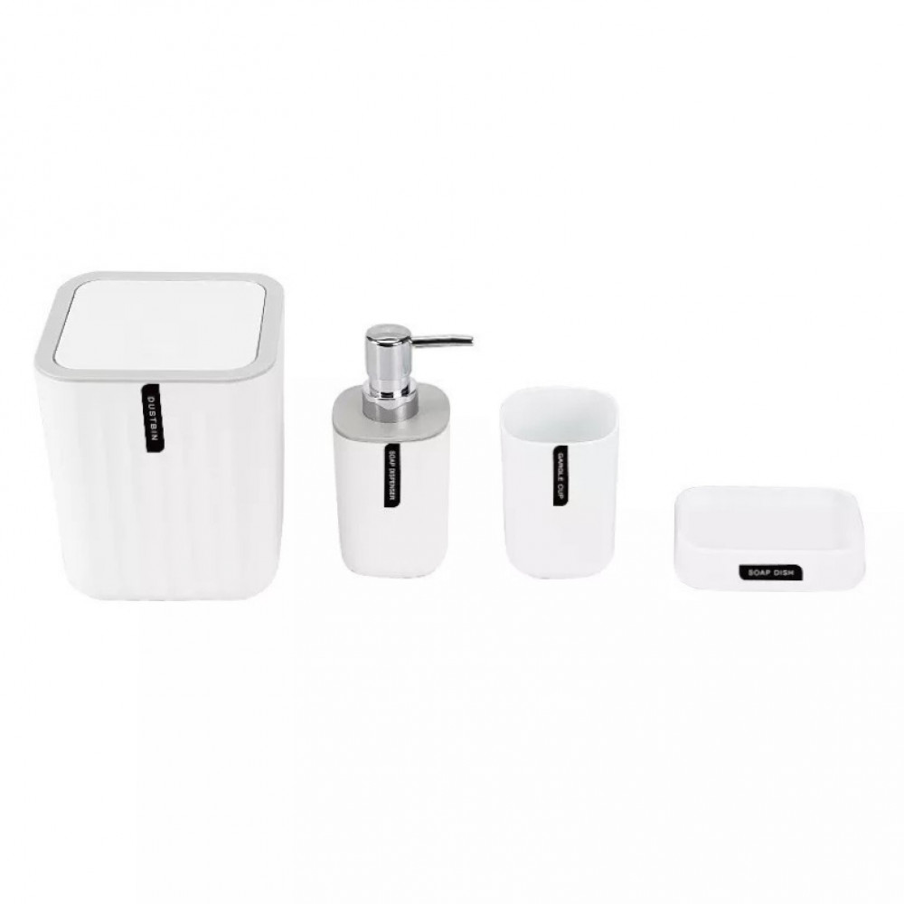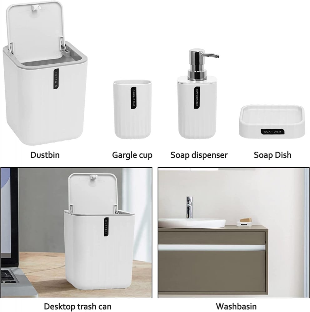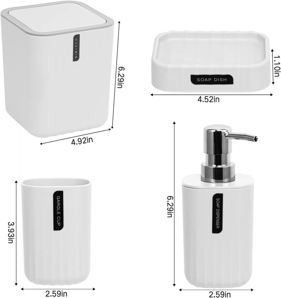 طقم ملحقات حمام من 4 قطع: يحتوي على: (سلة مهملات ووعاء صابون وكوب وحامل لوشن)؛ سلة المهملات: 14x14x16 سم ووعاء الصابون: 13x8x2 سم وموزع اللوشن/ الصابون: 7x7x17 سم والكوب: 7x7x10 سم